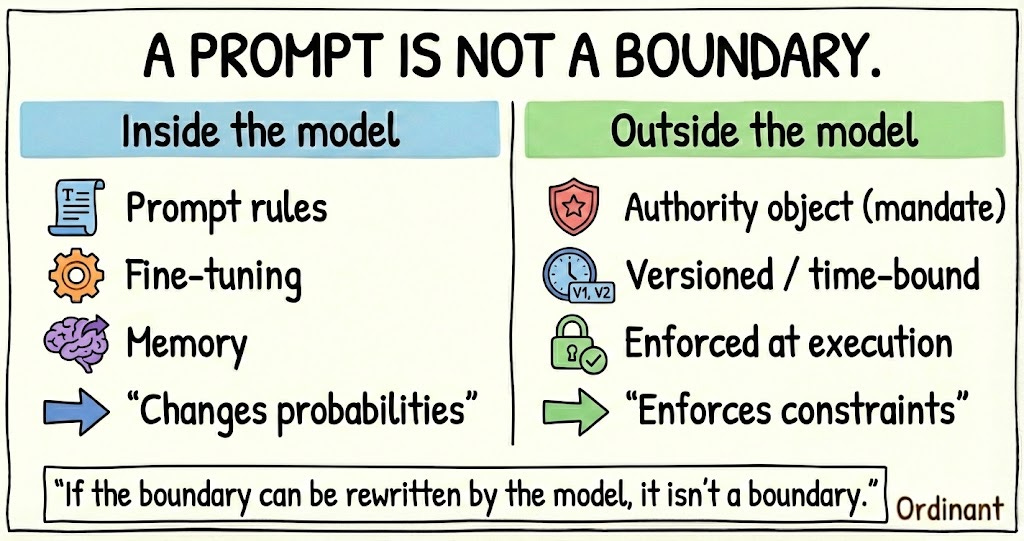If you want an analogy that kills the “just prompt it better” conversation: think jurisdiction. You don’t ask a court to infer its jurisdiction from the arguments presented. You declare it, publish it, and enforce it before the case begins. Air traffic control doesn’t infer a no-fly zone from pilot chatter.