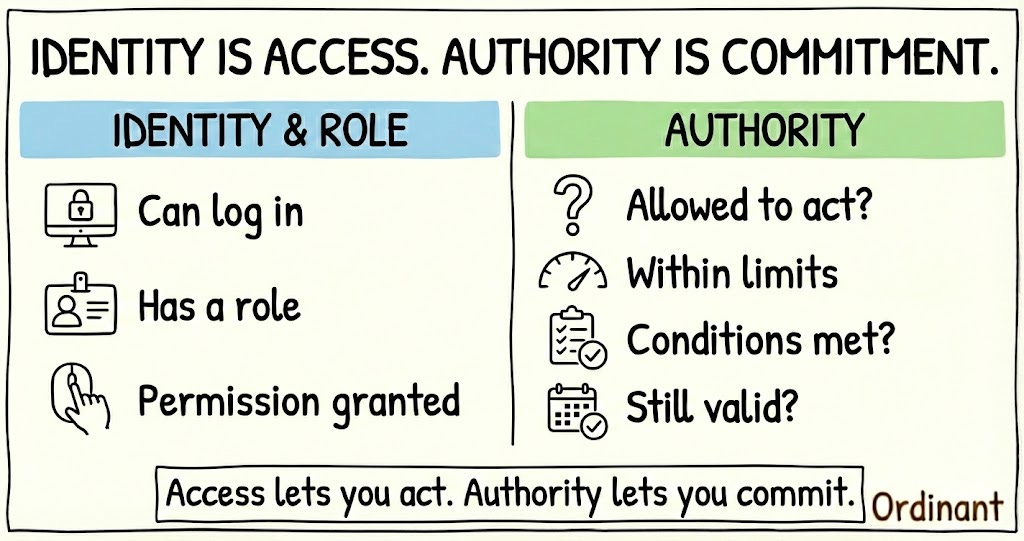 The question that matters once a system starts acting is different: What can this actor commit the organization to, on whose behalf, under which constraints, at this point in time?