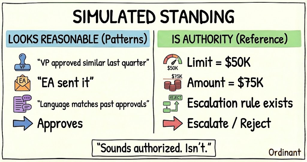 None of that is authority. It’s pattern completion, what you might call simulated standing. The model generated the language of authorization without possessing the state of authorization. It sounds legitimate because sounding legitimate is exactly what language models do.