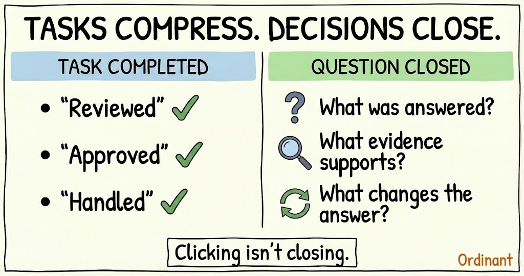 They have tasks, which compress judgment into vague verbs. “Reviewed.” “Approved.” “Handled.” The task completes. The bar stays implicit. You know something got done. You don’t know what question it answered or what would have changed the answer.
