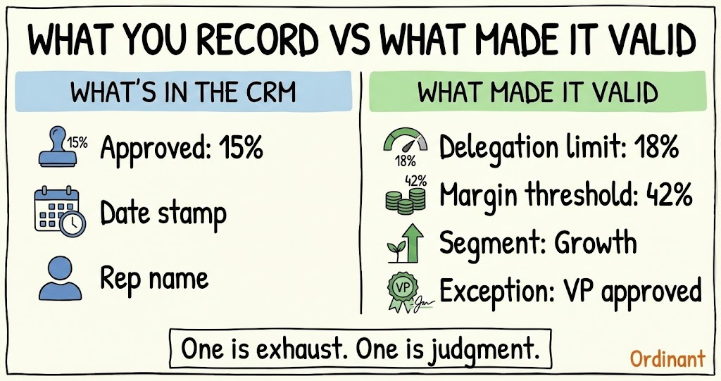 The CRM field says “Approved discount: 15%.” It doesn’t say that 15% was the maximum allowable under the margin policy in force at the time, that the approver had delegation up to 18%, that a strategic exception applied, or that the customer segment classification triggered a different rule set. The model sees the outcome. It doesn’t see the warrant.