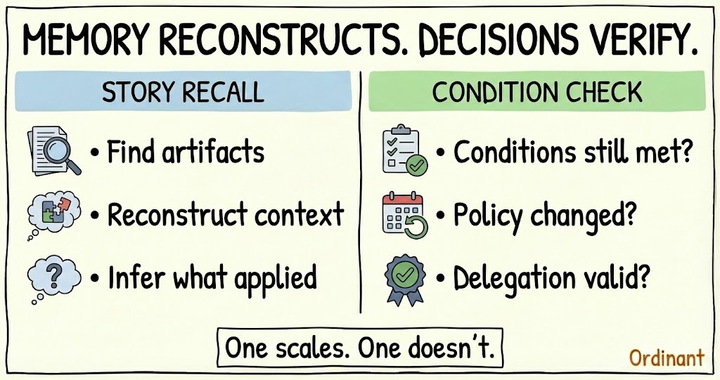 That’s the difference between story recall and condition check. Stories require re-interpretation every time. Conditions can be verified.