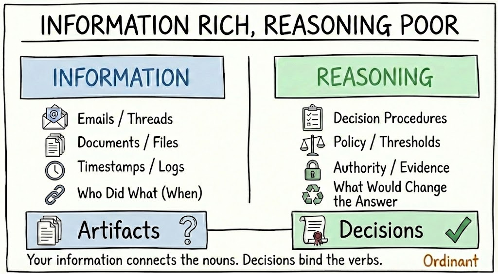 Enterprises are information rich but reasoning poor. They’re full of artifacts and empty of structured judgment. The substance of how work actually gets done (the constraints, the thresholds, the exceptions, the precedents) lives outside the systems we’re trying to train AI on.