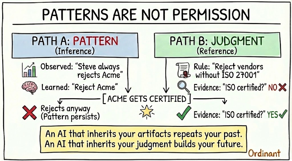 Consider a concrete example. An AI observes that Steve always rejects contracts from Acme Corp, and it forms a high-confidence rule: Reject Acme. But the actual reason, never written down, was that Acme lacks ISO 27001 certification. If Acme gets certified tomorrow, the inferred model keeps rejecting them because the past pattern still dominates. A reasoned system would accept them instantly.