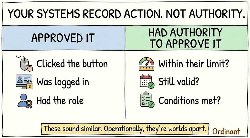 A system of record can tell you who clicked the button. It usually can’t prove they had the mandate to bind the organization at that moment, under those specific conditions, for that specific scope. It can’t carry forward the constraints that made the decision valid. It can’t distinguish between “this person approved it” and “this person had the authority to approve it.” These sound similar. Operationally, they’re worlds apart.